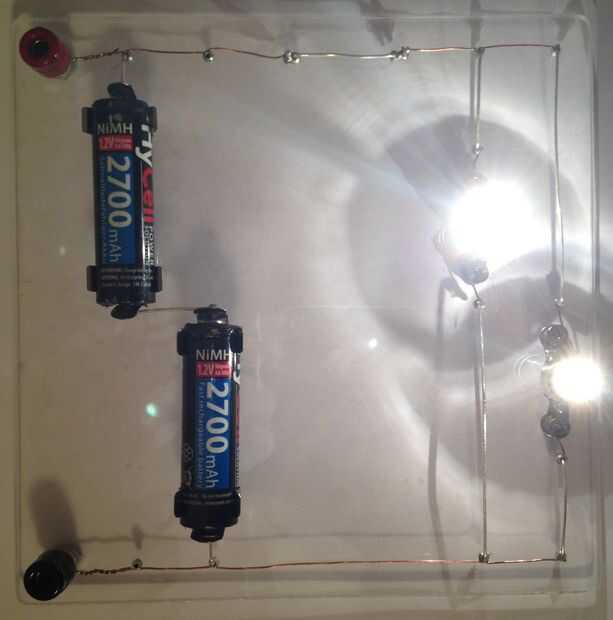 Piensa en las dos formas se pueden conectar ambas baterías (recordar experimento 5: dos formas de conectar a las bombillas) y tratar de predecir qué camino llevará a la meta! Luego probar y comparar el resultado a su predicción.