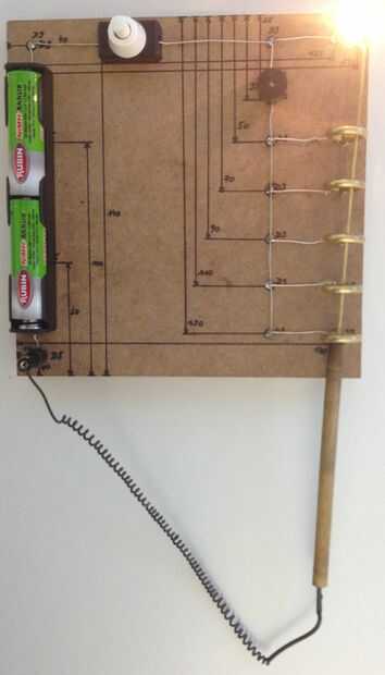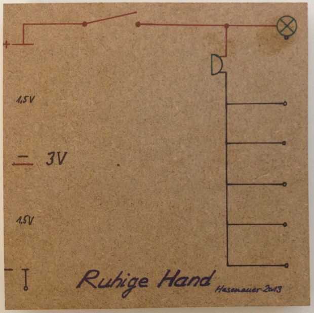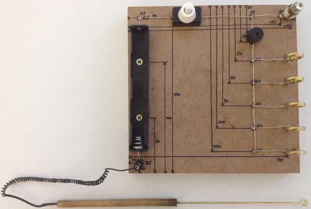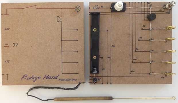 Para la fabricación, se necesita un tablero (como se indica en la hoja de datos, consulte el paso 1), un clip de batería de 1,5 dos v pilas (AA o AAA), un interruptor de dos vías (polo simple, tiro simple), un altavoz piezoeléctrico, una bombilla (E10) y correspondientes del zócalo (comparar la hoja de datos en el paso 1), alambre, cinco tornillos de ojo (M3, diámetro de 10 mm "ojo") y cable mangas final. Los segundos son inmersos en el tablero y utilizados para la soldadura de los cables (ver la tercera foto para detalles).