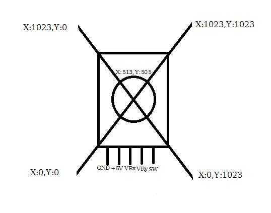 Pensé que puede ser útil para algunas personas, cuando configuración del circuito, subir el código a continuación se puede probar por ti mismo y ver las diferentes lecturas en cada dirección, en la foto de arriba me 5 posiciones de la palanca de mando y sus valores correspondientes. Diviértete con el código, jugar con él y se puede ver en el esquema que resistencia no fue unido al cátodo de LED, esto es porque la tensión de salida se ve muy afectada, ya que la palanca de mando sí mismo ya es un dispositivo de resistencia (potenciómetro). El código siguiente es muy fácil de entender, se convierte en el LED en X:1023, Y:1023 y vueltas él en X:0, Y:0 y usted también puede controlar los valores del serie fondo.