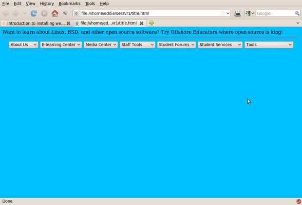 Para que un servidor web mostrar el contenido, debe ser páginas web (archivos con datos o instrucciones) que el servidor web puede utilizar para el servidor web para mostrar.  Index.html (o index.htm) es el nombre generalmente para el archivo por defecto que buscará un servidor web cuando se muestran páginas web.  Generalmente pero no siempre el index.html entrará en lo que se llama la raíz del web. Se trata de que el servidor web espera archivos al servir archivos. Por supuesto se puede cambiar este directorio. En un servidor de la lámpara, el directorio web raíz o base web es/var/www. No tienes que hacerlo, pero nos gusta usar el archivo index.html en la raíz del web (httpd www/index.html) como una especie de menú o de tarjeta de catálogo de lo que está en el servidor.