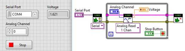 A continuación, crear un control en el bloque abierto de LINX para nuestro puerto serie y crear un control para el canal analógico en el bloque de lectura analógico. Conecte los cables recursos y error de la VI abierta de LINX a la VI de lectura analógica. Ahora Conecte los cables recursos y error de la analógica lectura VI al bloque de cierre de LINX. Ahora crear un indicador en el bloque de lectura analógico para la tensión de clic derecho sobre la tensión en el bloque terminal y haciendo clic en "crear indicador". Cuando termines, frontal panel y el bloque diagrama debería parecerse a lo que yo he en la foto superior.