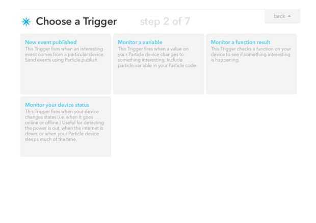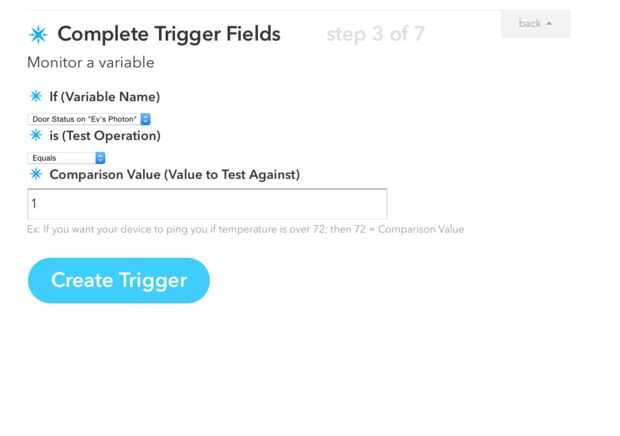 A continuación, haga clic en seleccione "Controlar una variable" de la variable que desea supervisar y seleccionar el valor que se compara contra el y el método de comparación. (variables aparecerá después de que el programa está en el fotón y ejecuta todos los scripts particle.variable.)