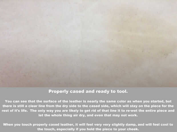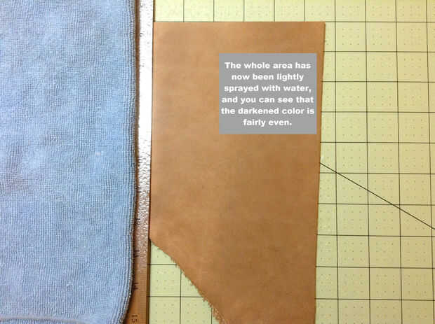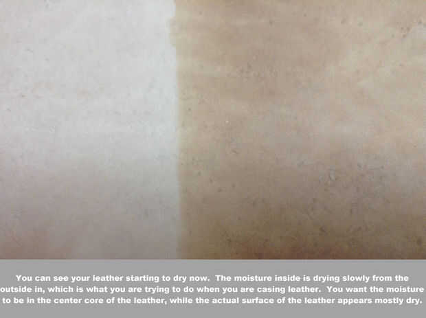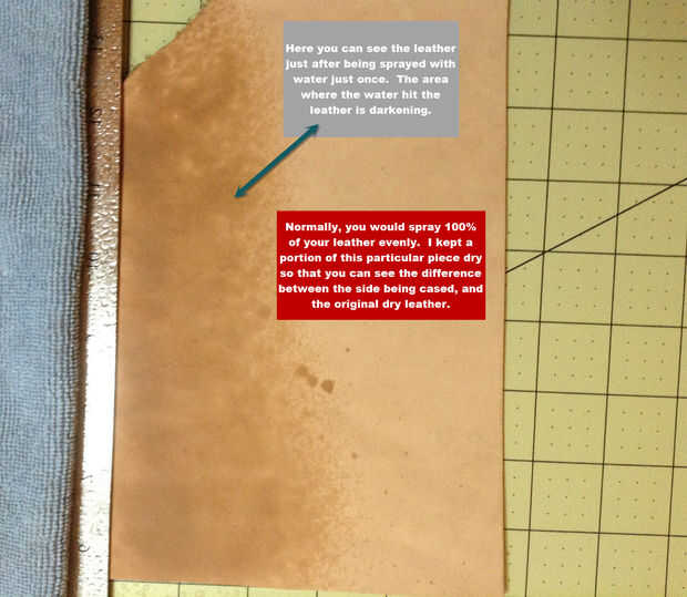 Así, mis 2 centavos en carcasa: mojar el cuero de una botella de spray. Evitar rociar hasta haber cubierto toda la pieza y que no inmediatamente absorbido y empieza a tomar un segundo o 2 en el cuero. Hay una parada de un minuto y asegúrese de que uniformemente han cubierto el cuero. Si no lo has hecho, rocíe el área que no estaba tan mojado hasta que coincida con el resto. Luego la vuelta la piel. ¿Es la parte de atrás de la piel totalmente seca? Si es así, suba parte de la piel espalda y darle otra capa de agua. Vuelta otra vez. Continúe haciendo esto hasta que empiece a ver el agua de remojo a través a la parte posterior de la piel. Una vez que eso sucede, parada de adición de agua.
