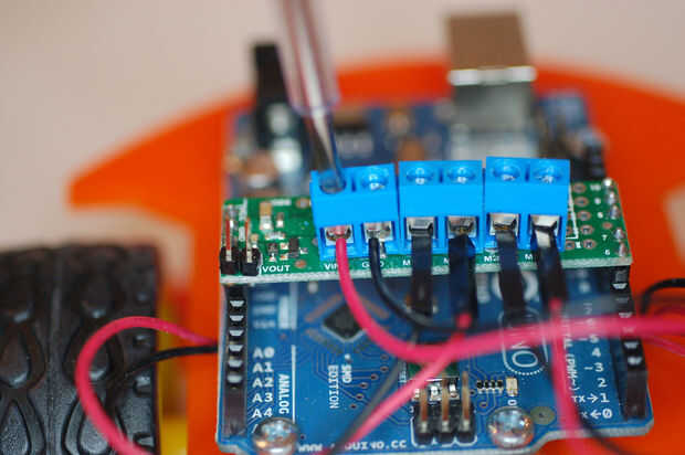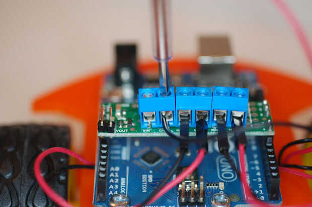 2. Afloje el tornillo situado sobre el dintel terminal azul, luego inserte el cable de batería rojo al VIN fuera de la cabecera terminal azul en el regulador del motor. Apretar el tornillo un poco.