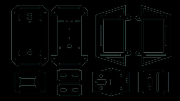 El Zumo es un gran comienzo para el montaje de otros componentes electrónicos. Para mantener todo en su lugar, he diseñado un chasis de acrílico que los pernos en la base del Zumo. El chasis está diseñado para ser laser cortar de acrílico de 3 mm (~1/8in) y atornilladas sobre todo nylon 2-56 y unos tornillos de metal 4-40. Usando tornillos de plástico (es decir, no conductor de electricidad) para el montaje de la electrónica reduce la posibilidad de cortocircuitos eléctricos. He unido los archivos vector anteriores (si no tienes acceso a un cortador láser, usted puede utilizar un servicio como Ponoko). Acrílico es rígido y barato como un cuerpo material, pero es bastante frágil, así que doblé cualquier arista que podría entrar en contacto con un objeto mientras el robot está en movimiento. El chasis es bastante abierto, que consiste en un alto de "torre" que proporciona ranuras para las placas de montaje que sujetan el Edison, interruptor y controlador de motor. Este diseño mantiene todo lo visible y de fácil acceso debo necesito para desmontar el bot o cambiar un componente. El diseño del perno-junto permite todo para quedarse seguro, pero desprendible. Accesibilidad en el diseño dificulta la solución de problemas mucho menos cuando tiene que pasar,