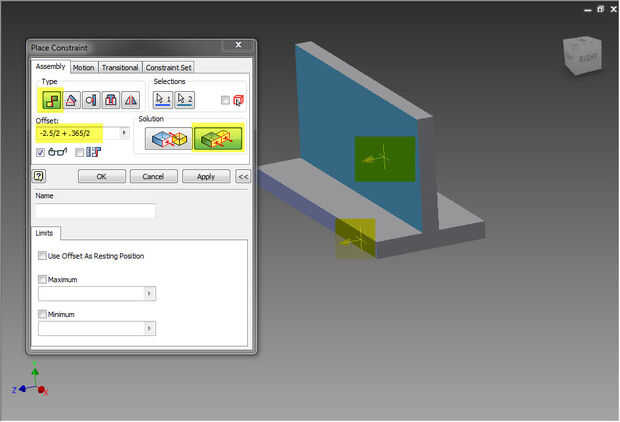 Centro de la placa mediante la restricción de "Flush" y un desplazamiento. Seleccione la cara como se muestra y los valores de entrada como se muestra en el cuadro de "Offset".