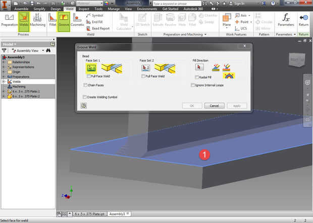 Seleccione "Groove" en la pestaña de "Soldadura". Para la cara establecer número 1 uso la selección que se muestra en la imagen. Cuando terminar de mover al siguiente paso.