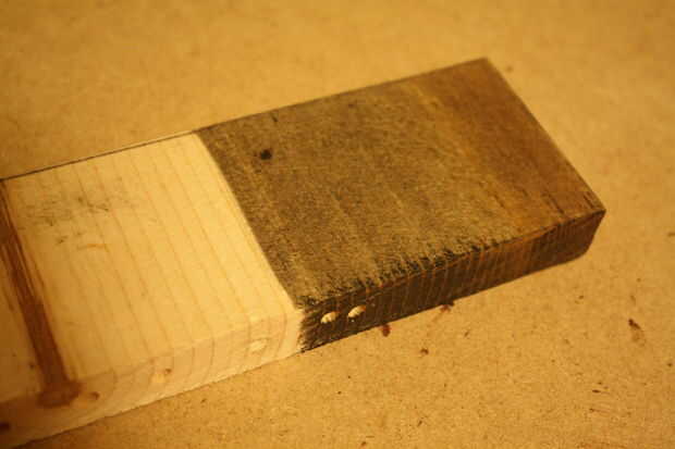 Tinta para madera es un líquido fino, color que penetra la superficie de la madera y marca ese color. Disponible para aproximadamente $8,00 en 1 cuarto de galón. Lijar la madera con papel de grano 180 hasta que esté suave y limpiar el polvo. Aplique el colorante untar un paño libre de pelusa en la mancha y frotando o utilice un cepillo de cerdas naturales para aplicar capas delgadas que se limpie el exceso después de 5-15 minutos. Siempre intento trabajar con el grano. Buenos trazos larga y definidas, no cosquillas la madera.