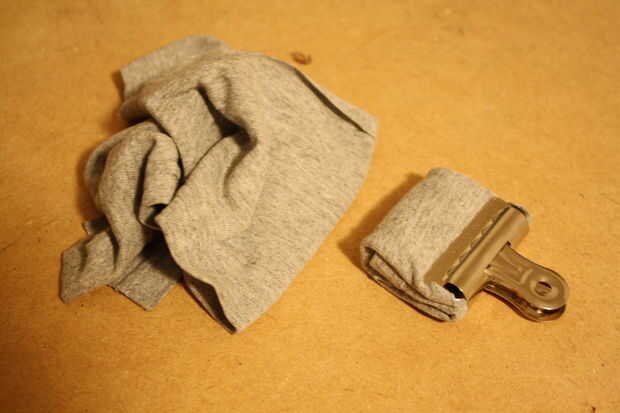 Cepillos naturales no están que caro; 69 centavos para un cepillo de 2" de puerto de carga o una caja entera de 36 de $10,95. Prefiero usar un viejo de algodón camiseta cortada 4 "x 8" que me doble en una pila y un clip de carpeta. El material es barato, absorbe bien la mancha y el borde redondeado reduce marcas de pincel, mientras que mantener mis manos limpia manteniendo el clip.