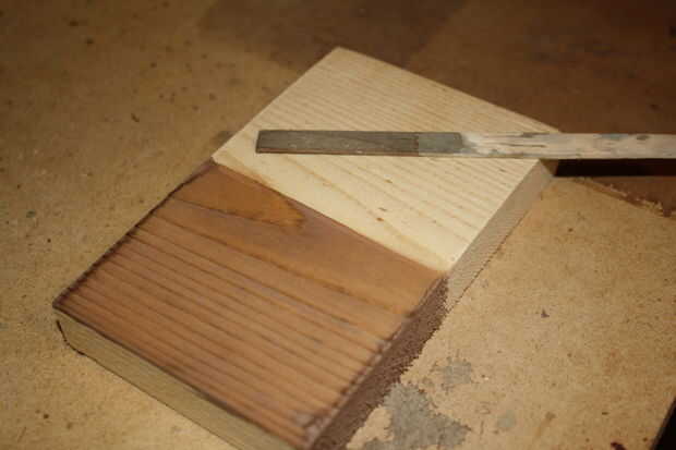 Cuele la mezcla a través de un filtro de café o un paño para eliminar las pequeñas partículas de metal. Del cepillo en la mezcla con un cepillo para dejar una capa húmeda, un paño no conseguirá la húmeda superficie suficiente. Una vez más, van con el grano al aplicar. Deje que la madera seca durante algunas horas e irá un magnífico color oscuro. Maderas blandas ir un azul-gris, grande para la crianza en madera nueva. Las maderas duras van más oscuras dependiendo del contenido de tanino de la madera. Caoba y roble van muy oscuros de esta reacción.