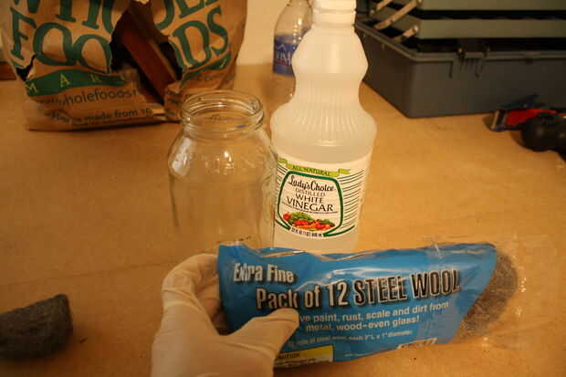 Colóquese unos guantes y un rollo de 0000# extra fino acero lana de alambre bajo agua caliente del grifo para lavar cualquier aceite inhibidor de moho. Asegúrese de que es realmente la lana de alambre en el paquete que yo sepa hay algunas imitaciones que no funcionan. Separe la lana de acero en una capa fina y colocar en un frasco de vidrio. Verter sobre el ordinario vinagre blanco hasta cubre la lana. Vinagre de sidra también es una opción. Si tienes algunos clavos oxidados, los tiro en demasiado y dejar el tarro con una tapa suelta para 24-48 horas hasta que las burbujas hayan detenido y el vinagre es más oscuras. Dar la jarra una sacudida cada rato / cuando usted camina más allá de ella.