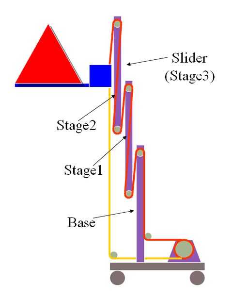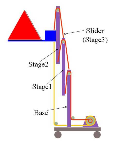 Elevadores con aparejo en cascada (se muestra en la tercera foto) tienen los cables que conectan cada fase de la elevación. Este resultados en todas las fases simultáneamente como el cable de levantamiento se dibuja. Sin embargo, cualquier cable de retorno debe tener una velocidad diferente que el cabrestante principal, que puede ser manejado mediante el uso de tambores de diferentes diámetros. Mientras que las secciones medias de un ascensor en cascada son menos susceptibles a interferencia, la tensión en los cables de fase inferiores es mucho mayor que en un ascensor con jarcia continua.