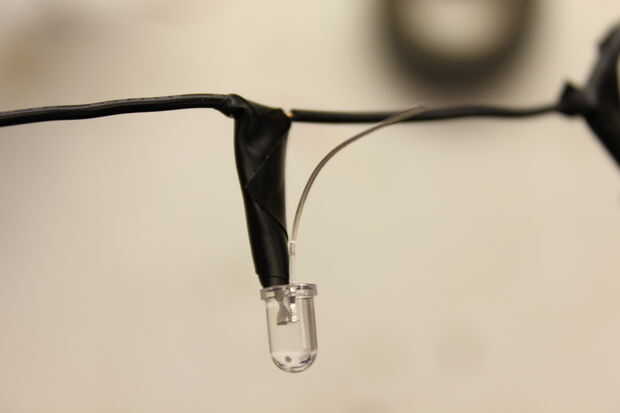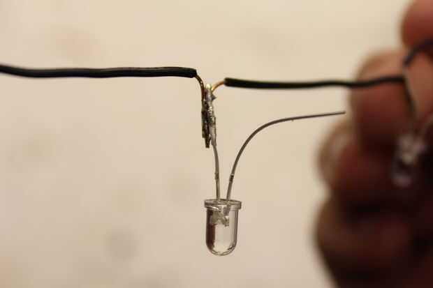 El leeds de LED positivo y negativo de la curva en direcciones opuestas (creando una forma de "T" o "Y") y una longitud corta de cable negro al extremo negativo de un LED de la soldadura.