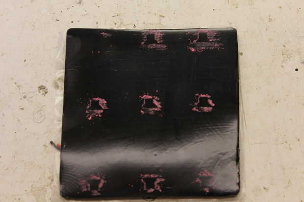 A continuación, coloque cuidadosamente la Plaza de poliuretano directamente en la cara del martillo. Asegúrese de no cambiar o mover el poliuretano una vez que se asiente. Aplique presión firme y directa para el poliuretano durante unos segundos y luego Pelar cuidadosamente la goma de la cara del martillo. Si se realiza correctamente le deben se nueve bien definido marcas indicando la posición de los LEDs (ver imagen 2).
