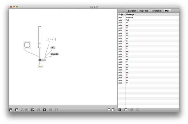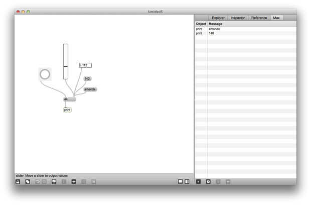 Conectar un botón a la entrada izquierda del objeto abajo del mensaje. Haga clic en él y ver cómo se imprime el mensaje almacenado en el objeto en la Max Window. Trate de asociar objetos a la entrada izquierda del objeto de mensaje: un número, un "slider". Cambio el contenido del objeto de mensaje, pero no causar salida. Si usted los gancho hasta la entrada de la izquierda del objeto de mensaje verás que causan el mensaje de salida, pero no cambian el mensaje.