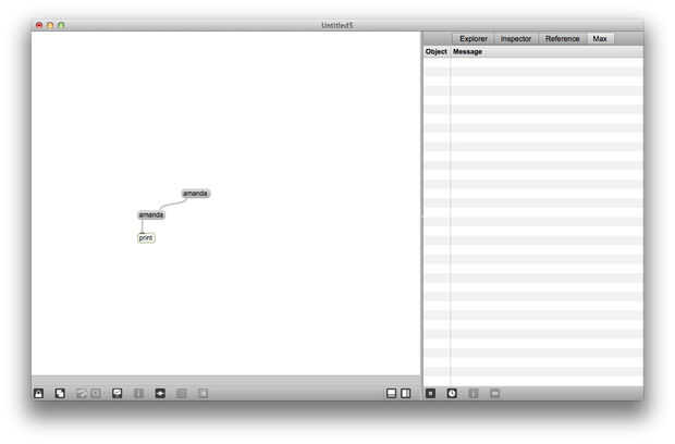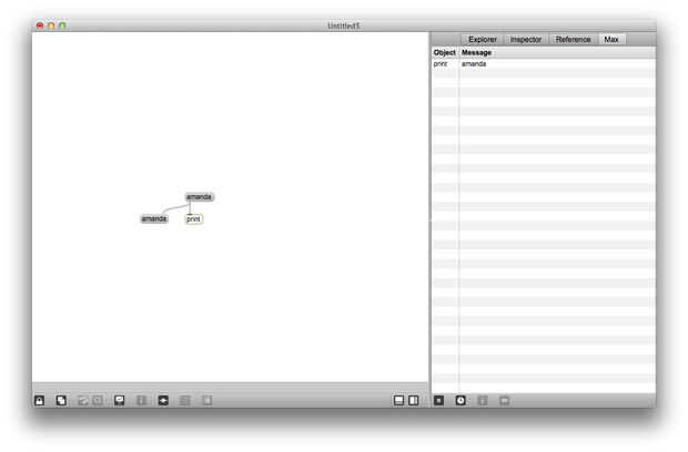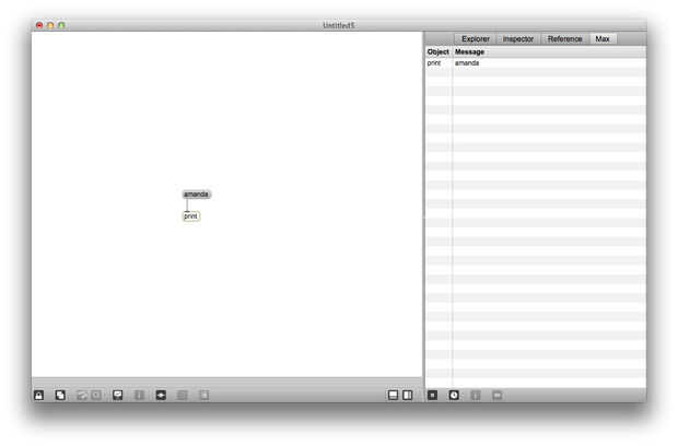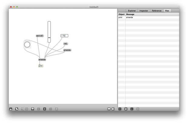 Usted puede ya haber notado que algunos objetos son útiles para la depuración de parches: número de botones, palancas, objetos todos dan retroalimentación sobre qué mensajes se envían entre los objetos. El objeto del mensaje puede utilizarse de una manera similar. Crear un objeto de mensaje en blanco y cable hasta la entrada de la derecha del nuevo objeto a la salida del mensaje de nombre. Ahora el parche de la cerradura y haga clic en el nombre de mensaje. Puesto que el objeto impresión todavía está conectado al mensaje que usted recién oprimió, usted debería ver una segunda impresión de su nombre en la Max Window, también se debe ver su nombre en el segundo mensaje. Para enviar mensajes en la entrada de la derecha de un objeto de mensaje, puede establecer el objeto del mensaje que usted desee.