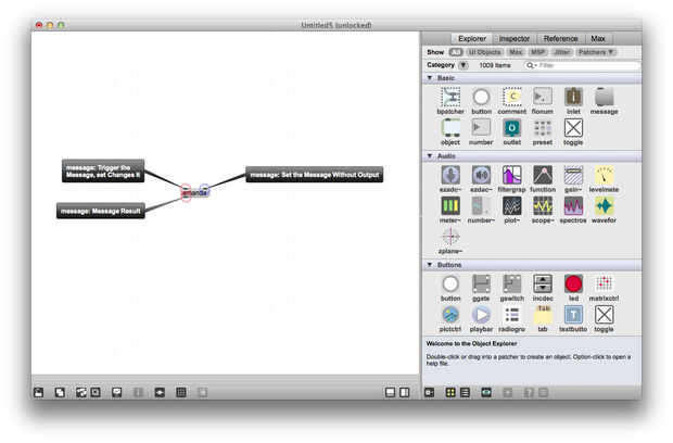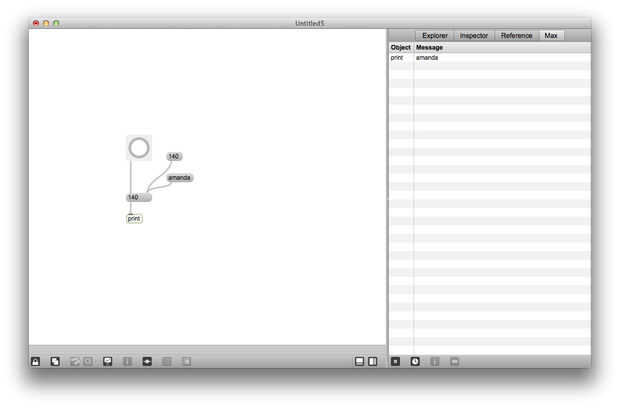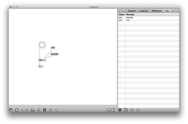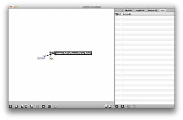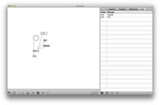 Desconectar el objeto grabado el primer mensaje y conectar a la salida del segundo objeto mensaje (aguas abajo). Ahora, haga clic en el objeto de mensaje superior otra vez. No debería ver ningún impresiones adicionales de su nombre en la Max Window. En Max, cada entrada y salida tiene una designación frío y caliente. Se puede saber si una entrada o salida es caliente o frío por pasar el ratón sobre ella y notar el color del círculo que pone de relieve, ya sea rojo o azul. Cuando se envía un mensaje o una explosión a una entrada caliente, hace que el objeto a evaluar el mensaje y enviar algo al menos uno de sus puntos de venta. Cuando se envía un mensaje a una entrada de agua fría, el objeto de evaluar el mensaje, pero que no provocará la salida.