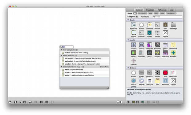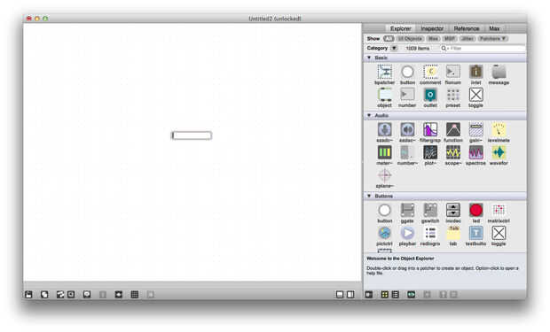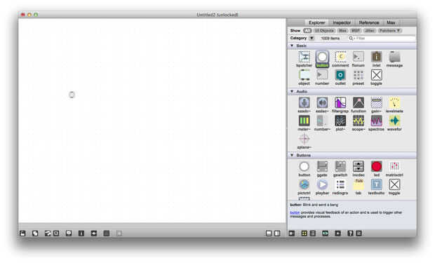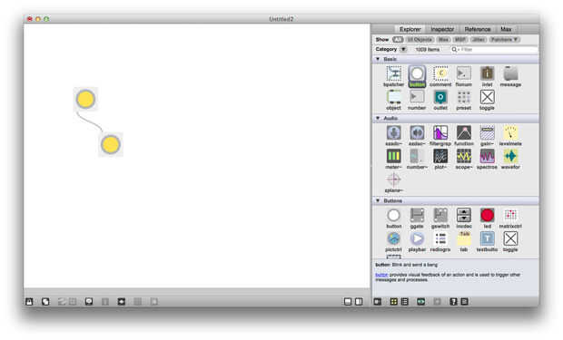 Parches de Max se componen de muchos "objetos" que en conectarse juntas. Para crear un objeto, coloque el cursor sobre el parche en blanco y pulse la tecla n. Usted verá un oval aparece, es donde dices Max qué tipo de objeto que desea crear. Uno de los objetos más simples es el objeto de botón, crear un objeto de botón "button" en el objeto oval en blanco que acaba de crear y pulsar intro. También puede encontrar el objeto de botón en el menú de la derecha bajo el encabezado "Basic" y arrástrelo en el parche.