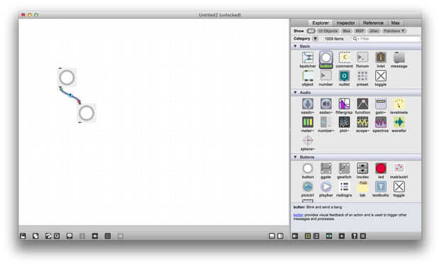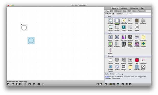 Para interactuar con estos objetos, poner el parche en modo de bloqueo haciendo clic en el icono de candado en la esquina inferior izquierda de la ventana (comando + E / Ctrl + E). Ahora haga clic en el botón de arriba, usted verá luz y también causar el botón inferior a la luz hasta. Cuando se hace clic en un botón, enciende para arriba y envía un mensaje que llamó un "bang" a su salida. Cuando un botón recibe un golpe, se enciende y pasa la explosión a través de su salida.