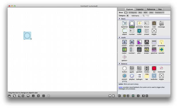 Objetos en Max pueden cambiar el tamaño arrastrando la esquina inferior derecha. Mover un objeto seleccionándolo y arrastrándolo por el parche. Copiar un objeto manteniendo pulsada la tecla opción y arrastrar, luego su copia en algún lugar en el parche.