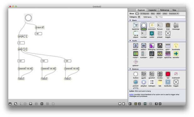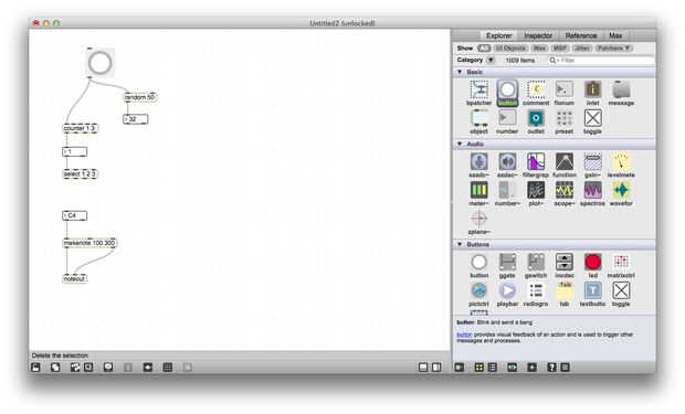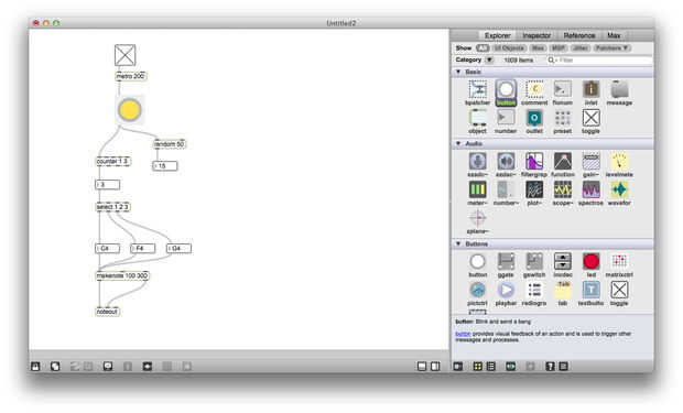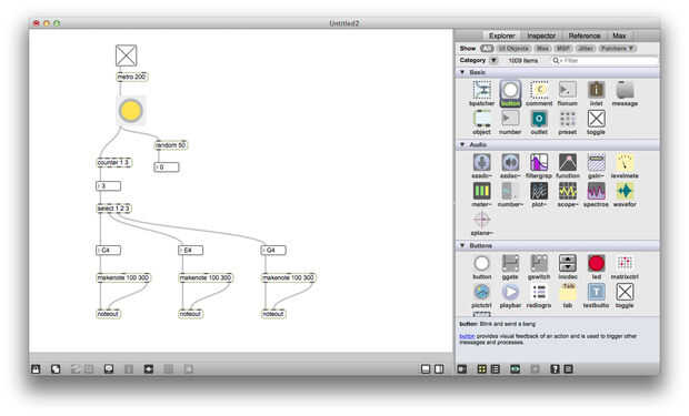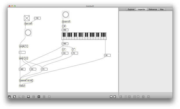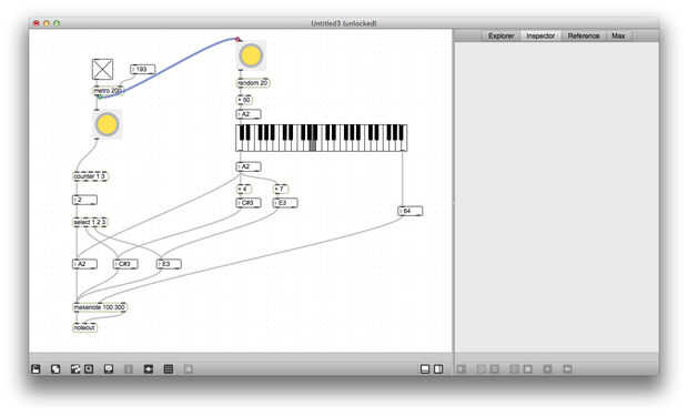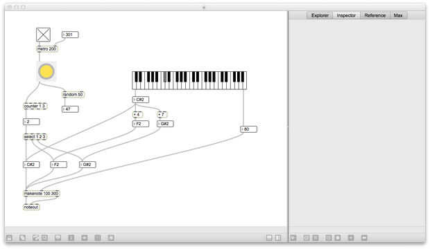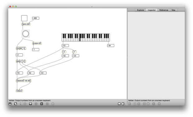 A continuación utilice el generador de números aleatorios para enviar la nota de base de los acordes principales. Para mantener esto un poco más listenable, cambié la gama al azar a 20 y 50 ha añadido a la salida, por lo que el número generado es siempre entre 50 y 69 años. Ahora iniciar el parche y ver qué pasa al hacer clic en el botón al azar. ¿Qué pasa si conectas la salida del metrónomo para el botón al azar?
