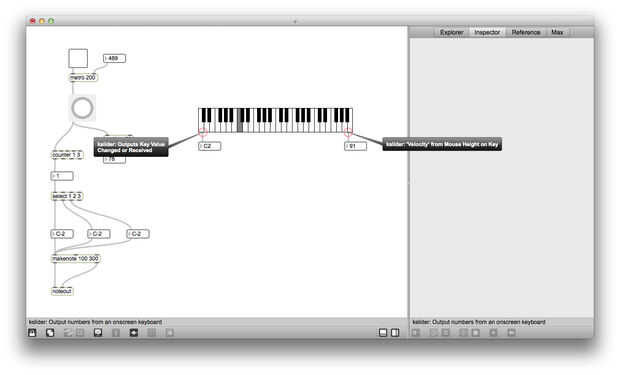 Incluso nos podemos conectar la velocidad de salida de la kslider a la velocidad de entrada de makenote para invalidar el valor predeterminado de 100 que hemos creado anteriormente. Trate de hacer clic en la parte superior e inferior de las teclas en kslider para oír la diferencia.