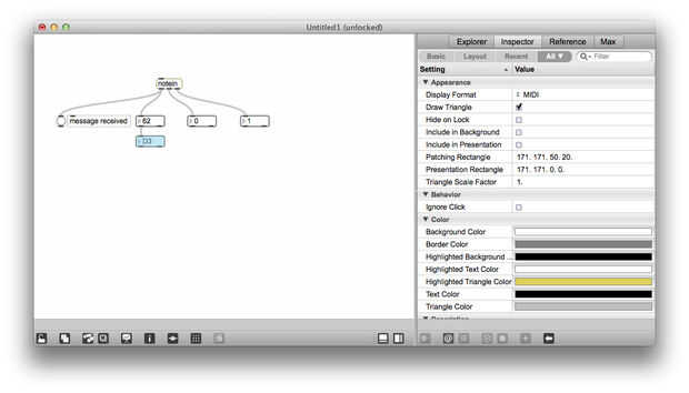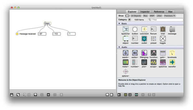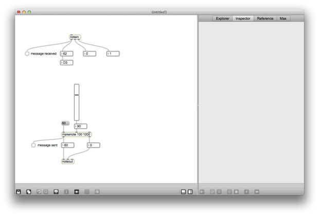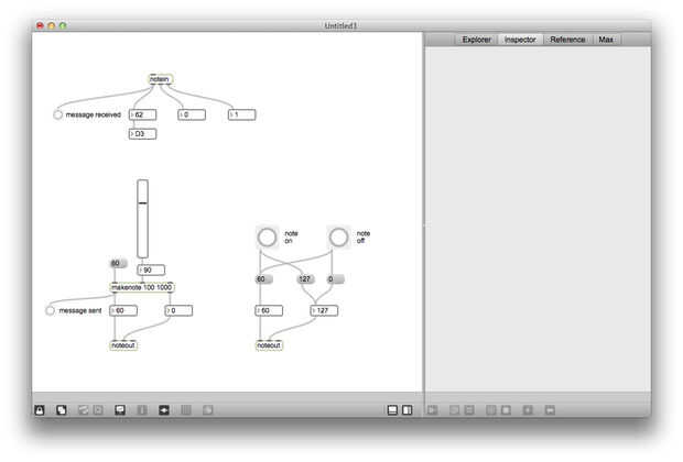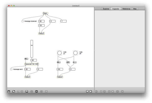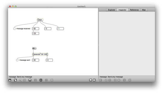 Ahora pulse el mensaje 60 para crear una nota de MIDI. Verá el botón enciende dos veces, una vez para una nota en mensaje con tono = 60 y velocidad = 100 y una nota mensaje un segundo más tarde con la echada = 60 y velocidad = 0. Conectar un objeto de noteout y escuchar la nota al ver los mensajes MIDI en Max.