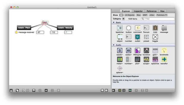Los mensajes enviados cuando se presiona una tecla se llaman "Nota sobre" los mensajes. Cada uno de estos mensajes devuelve una echada, velocidad y un canal. Como he dicho antes, paso devuelve un valor entre 0 y 127, donde armar = 60 corresponde a C3 (en la tercera octava), pitch = 61 corresponde a C# 3, etc.. Fije otro objeto número esta salida y lo quieras en MIDI para ver el terreno de juego. Cada nota en el mensaje también contiene una velocidad de cero. Si tienes una velocidad teclado sensible conectado al máximo, intente presionar la tecla con diferentes cantidades de presión para ver cómo afecta la velocidad. El valor máximo de velocidad es 127.