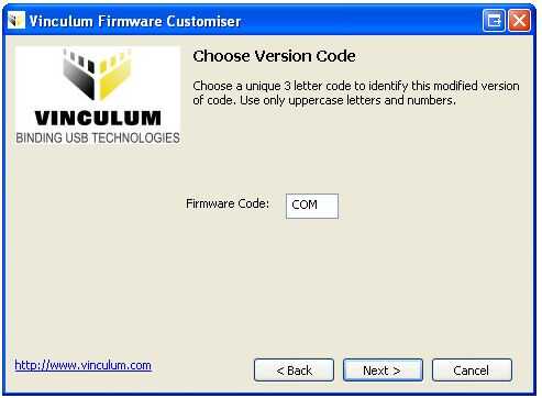Ahora, simplemente haga clic en siguiente a través del resto de las opciones. Se le pedirá para un identificador único de 3 caracteres para tu firmware personalizado. Creé dos firmwares diferentes y utiliza estos identificadores; COM para hyperterminal amigable (éste) y MCU para la versión amigable del microcontrolador. Estamos solo preocupados con la versión hyperterminal para este instructable.
