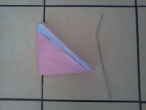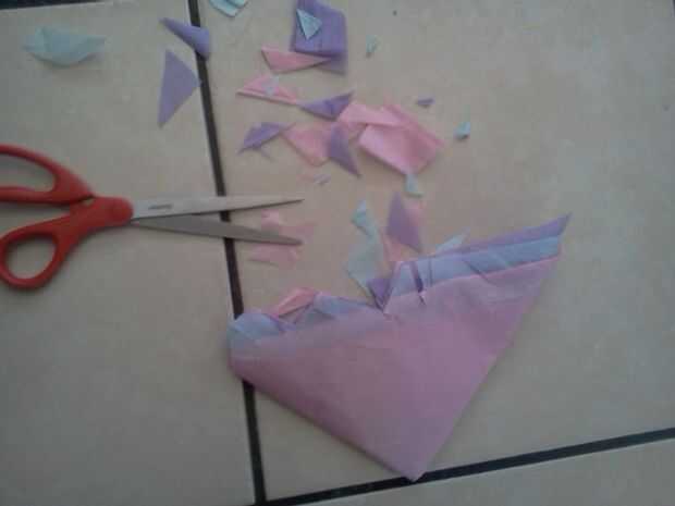 empezar por conseguir tres colores y doblarlas para hacer un triángulo. cortar la parte superior del papel para hacer un diseño, lo que quieras redondos picos.