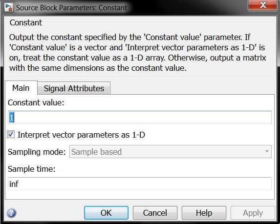 Para cambiar las propiedades de los bloques, haga doble clic en el bloque y una ventana como la imagen se abrirá. Se trata de las propiedades del bloque constante, aquí puede cambiar el valor de la constante de 1 a decir, 5.