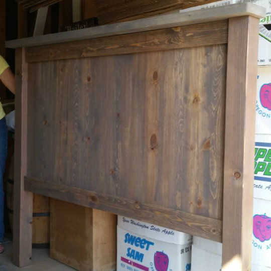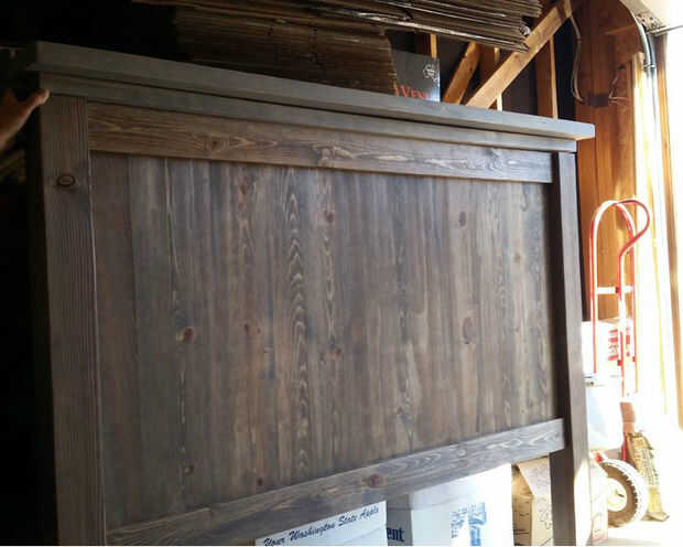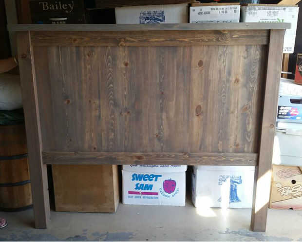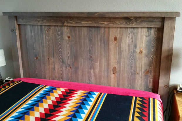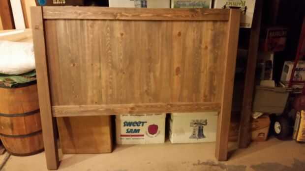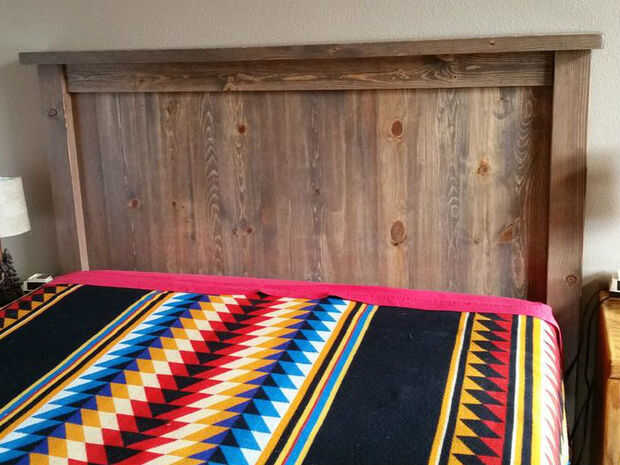 Para terminar aplica poliuretano Minwax satén a toda la pieza con tres capas siguiendo las indicaciones con cuidado. Una vez hecho esto, esta cabecera fue llevado a la habitación y colocado a la cabeza de la cama. Dos fieltro cojines fueron colocados en la parte posterior de la cabecera para proteger la pared y la cabecera. Ver el resultado final. El coste incluyendo los tornillos de bolsillo, madera, tinte y acabado era alrededor $75-80.