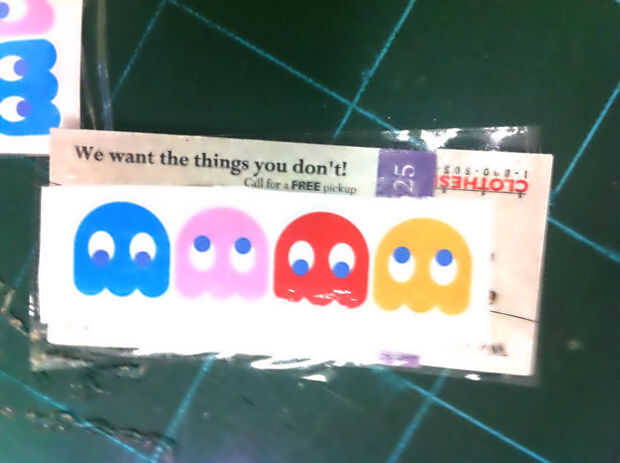 Ahora es el momento de añadir los imanes a los personajes de pac-man. Utiliza cinta adhesiva de doble cara y ponerlo en la parte posterior de los personajes laminados, despegue la cinta de por lo que está pegando al personaje y es pegajosa para fijar el imán a se.