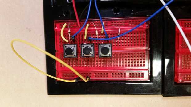 El circuito utilizado para los tres botones de entrada es también de libro de Kit Guide del Sparkfun Inventor. Este esquema se puede encontrar aquí.