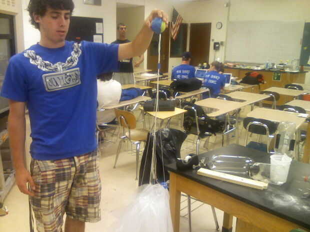 Atar los extremos de las cuerdas no atados paracaídas juntos. Cinta adhesiva los extremos de la pelota de tenis.