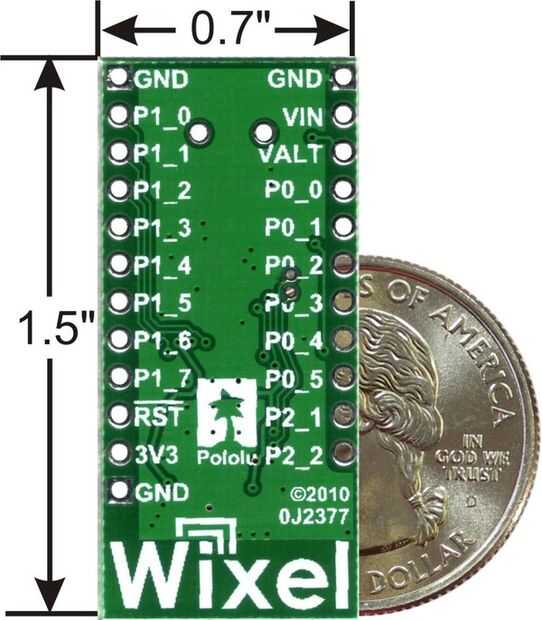 "El Pololu Wixel es un módulo programable uso general con un radio de 2,4 GHz y USB. El Wixel es basada en el microcontrolador CC2511F32 de Texas Instruments, que tiene un receptor de radio integrado, 32 KB de memoria flash, 4 KB de RAM y una interfaz USB de velocidad completa. Un total de 15 líneas de E/S propósito general están disponibles, incluyendo 6 entradas analógicas "