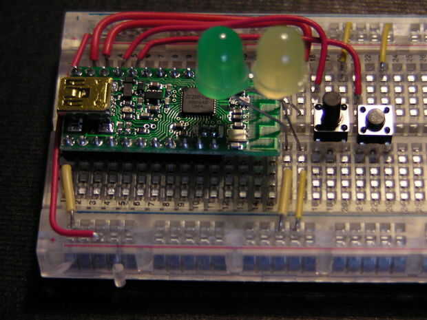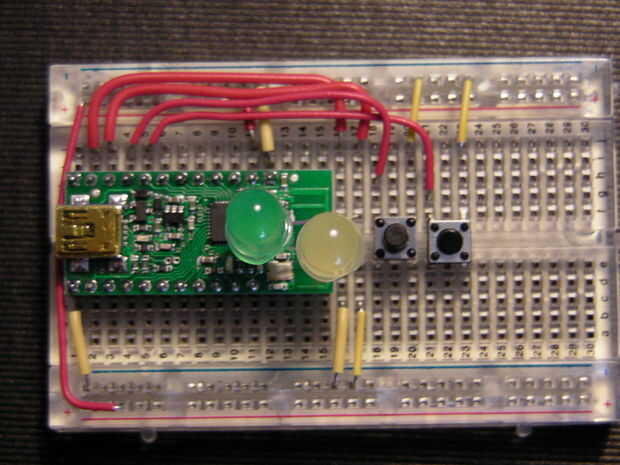 p.d.: he tenido un comentario que debe ser resistentes a la guerra en el cuircits del LED. Decidí no usarlos para esta demostración rápida y sucia. Han sido mis encendidos durante horas sin ningún problema. Si estaban haciendo esto para un dispositivo de largo plazo debe utilizar un resister 58 ohmios del perno - ive LED al bus - ive (Gnd) en lugar de puentes de alambre. Para proyectos con voltajes más altos esto se vuelve más importante.