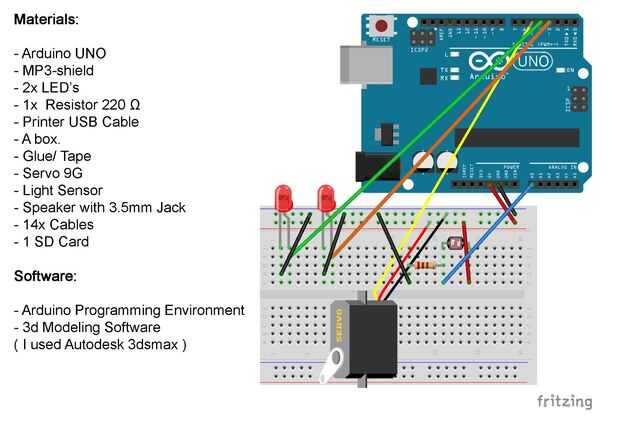 Hacer su propia caja de música!Materiales:Batería de 9VMateriales de la caja (de cartón, tijeras, cinta, marcadores)Energía P1Horquilla de W7Botón de i3I20 Sana del disparadorW6 ArduinoW1 Alambre (2)O3 RGB LEDO5 Motor de la C.C.O24 Synth altavoz(Util