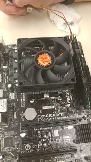 Colocar el disipador en la CPU y asegúrese de que las lengüetas estén alineadas firmemente con y sosteniendo a los ganchos de lengüetas de plástico en la placa base. Cuando se fije firmemente, tire de la palanca pequeña en el lado del disipador de calor hasta que encaje en la posición cerrada. Coloque el enchufe de alimentación para el ventilador en el cabezal de ventilador de la CPU en la placa base, asegurándose de que el cable no toque el ventilador sí mismo.