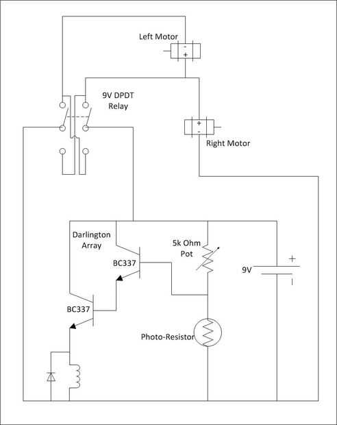 Consulte el diagrama del circuito en la segunda foto. Cuando la resistencia de la foto ve la luz, el robot impulsará. Los motores izquierdos y derecho están recibiendo 9V mediante el contacto normalmente cerrado del relé.