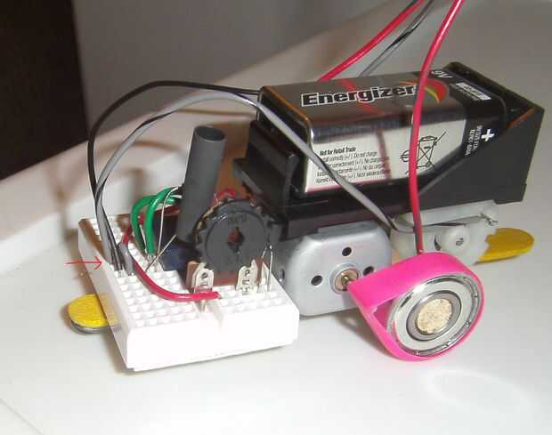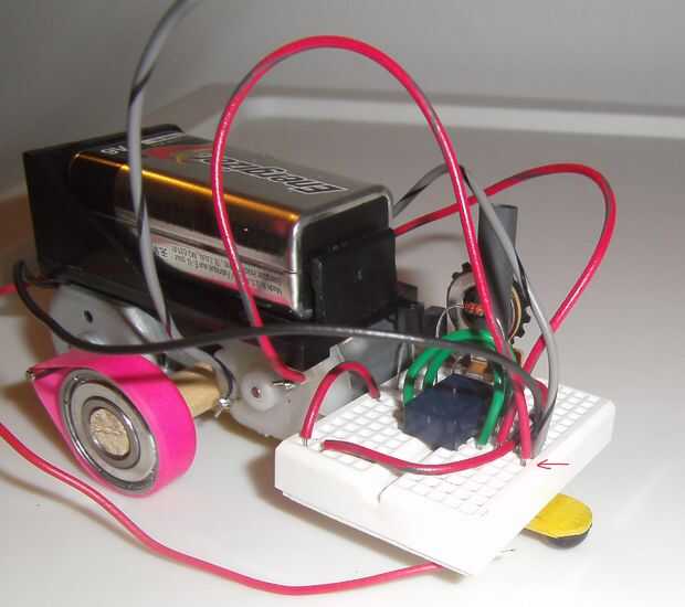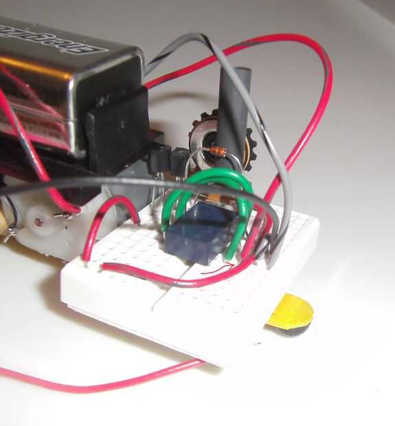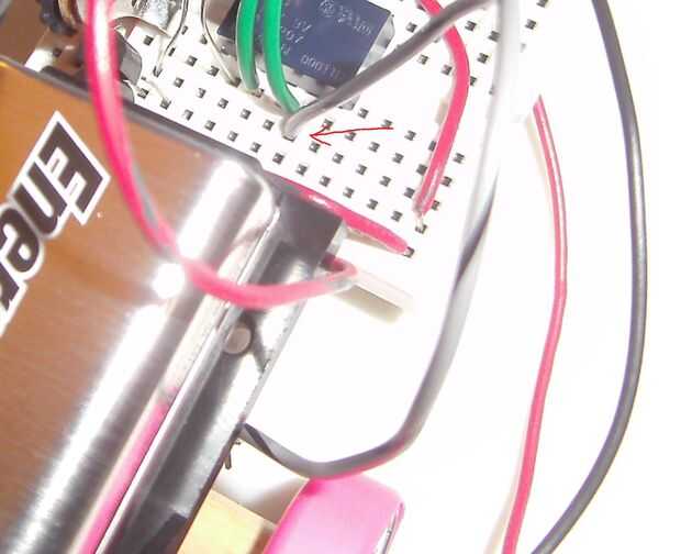 Vamos a conectar el motor derecho primero (es decir, el motor que ejecuta la rueda derecha). Tomar el '-' conexión, que debe ser un cable negro o gris e introducir en el borde superior de la placa, dos agujeros a la derecha del cable negro desde el portapila. Esto deja un agujero vacío entre ellos. Debido al alambre de puente corto que hemos insertados anteriormente, esta conexión del motor ahora está conectada eléctricamente a tierra. Ver la primera imagen abajo.