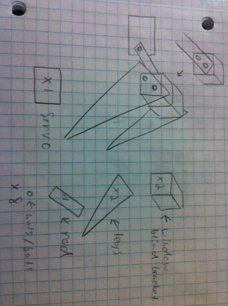 Ahora que ya tenemos los servos montados tenemos que asseble las piernas. Primero coloque la barra a los soportes de persianas de ventana. Coloque la varilla en un ángulo entre los dos soportes y taladre dos orificios. Inserte los pernos y las tuercas. Ahora coloque las piernas en los soportes, haga dos orificios, inserte los pernos y listo. Ahora lo único que tienes que hacer es fijar la pierna al servo con el tornillo que viene con el servo.