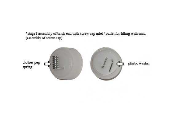 Roscada los extremos doblados de la primavera a través de dos agujeros perforados en la tapa. Pensé que el ladrillo podría ser rellenado con legumbres secas o grava de acuario para peso, como arena podría escapar de los agujeros en la tapa. Sin embargo el grueso del panel lateral significó que allí sería muy poco espacio en la cavidad entre la parte posterior de la boquilla y la pared del tubo de forma de la primera "agujero-