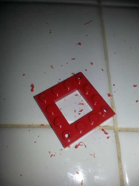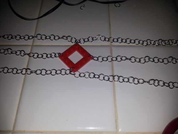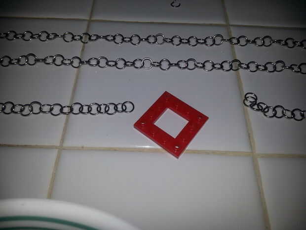 Elegí un rojo cuadrado hueco para la 'joya' y luego utilizando la herramienta giratoria para perforar un agujero en cada esquina de la misma manera que todos los pisos LEGO se perforan - por detrás, el pip apropiado para iniciar el agujero. He añadido un anillo de saltar a cada esquina, y conecté el LEGO en el centro de las cadenas superior e inferior. Entonces quité algunos enlaces de la cadena de centro para conectar a los lados izquierdo y derecho de lo LEGO. Los tres de las cadenas a la izquierda entonces se unen a un anillo de salto único y ese anillo para el cierre de 9mm. La derecha se maneja del mismo modo, excepto conectado a la ficha que conecta la hebilla.