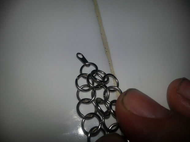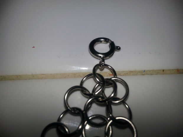 Luego, utilice la cinta de tela para medir el diámetro del cuello que va ser que lo usa. Si usted está haciendo el collar con anillas de 9mm, se necesitan aproximadamente 45 anillos para cada 10 pulgadas de cadena. Iniciar con la apertura de un solo anillo y Deslice dos anillos. Luego cerrarla. Repita con la frecuencia necesaria para hacer que la longitud de la cadena necesita-cada 15 'tríadas' son diez pulgadas.