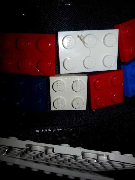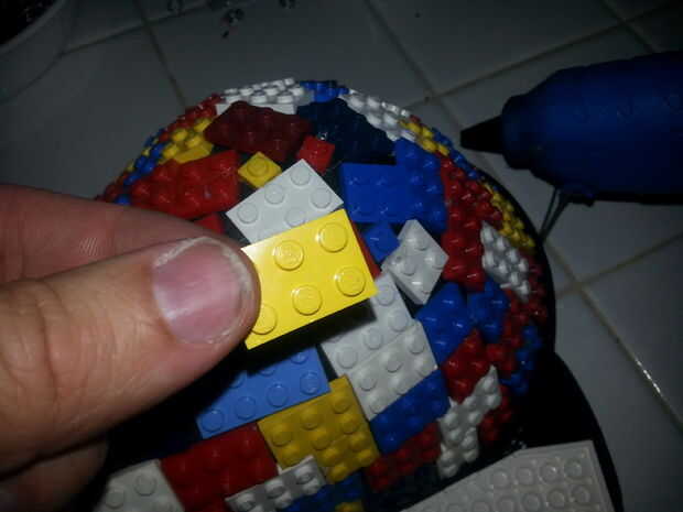 Seleccione más pequeños LEGOs para el proyecto - como 4 x 4 o 4 x 6. Desde el borde exterior de una taza y trabajar hacia el centro. Pegarlos como si estás haciendo un mosaico de cada una de las tazas. No te preocupes los huecos pequeños, puede ser abordados con LEGOs aún más después. Poner una gota de pegamento en el centro de cada LEGO y sujetador en su lugar con el pulgar y el índice. Tener cuidado! Si tienes la pieza en su lugar mucho tiempo, corres el riesgo de quemarse. Recuerde que el pegamento derrita un poco la tela, la buena noticia es los dos va ser bastante bien consolidados, y el sujetador puede lavarse a mano. La mala noticia es supurando materia derretida y pegamento se lastimarte, así que asegúrese de que usted vea lo que está haciendo. Una vez terminado, llenar las lagunas con 1 x 3, 1 x 2 o 1 x 1 piezas.