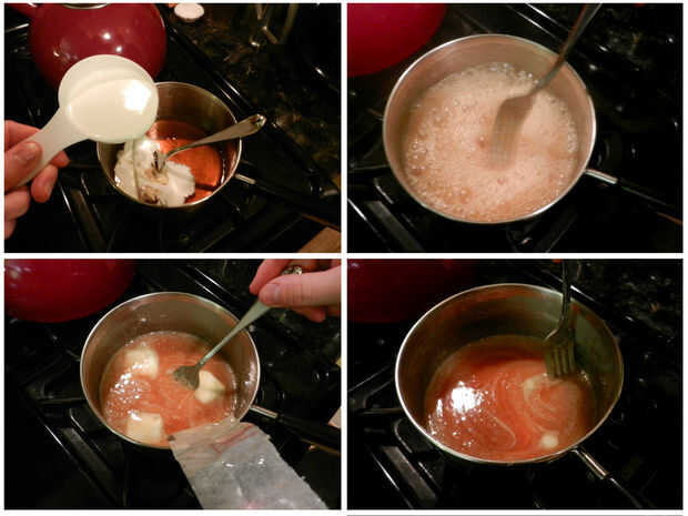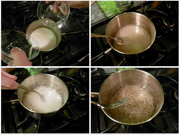 Para hacer el caramelo, añadir el azúcar, el agua y el jarabe de maíz en una cacerola mediana. Cuando mides el jarabe de maíz, consideran que medir un poco en el lado generoso, porque tiende a adherirse a la cuchara, y un poco de azúcar extra no lastimará su caramelo. Poner a hervir sobre fuego medio, revolviendo con la frecuencia que sea necesario. Una vez que lleva a ebullición, dejar marrón.