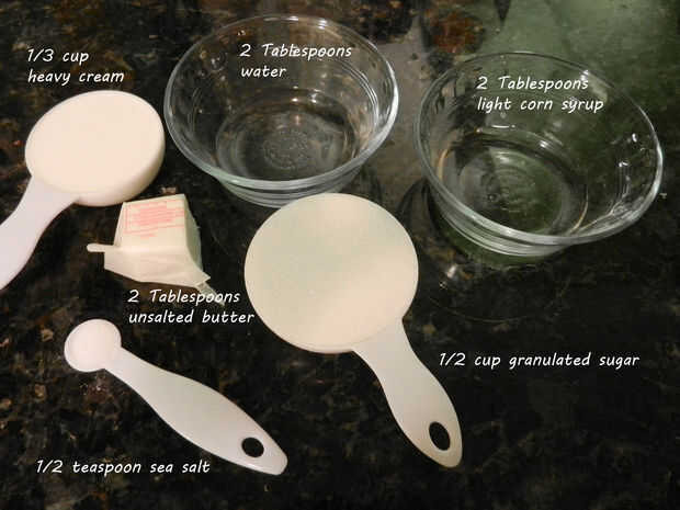 granulado de 1/2 taza de azúcar 2 cucharadas de agua 2 cucharadas jarabe de maíz ligero 1/3 taza de crema espesa 2 cucharadas de mantequilla sin sal 1/2 cucharadita de sal de mar