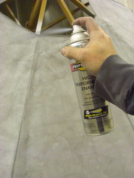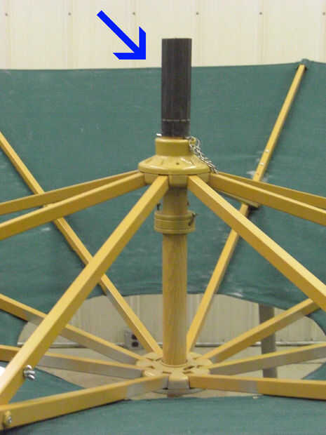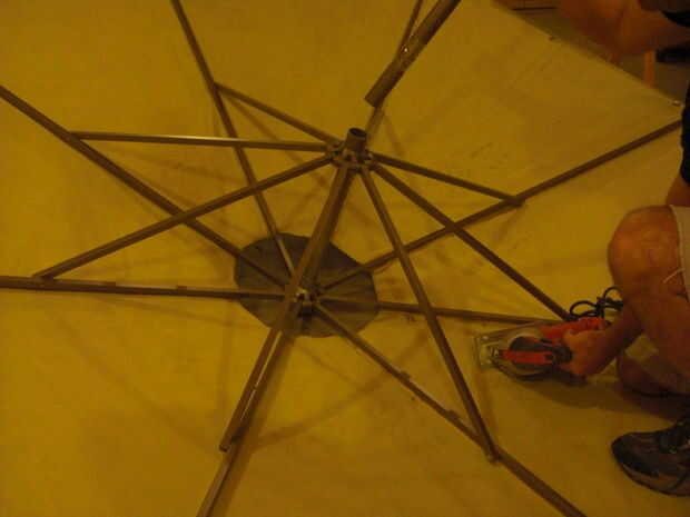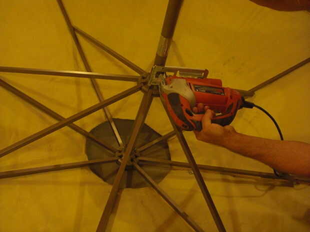 En el inicio de la construcción, retire y deseche el ducto de tela pequeña. Abierto el paraguas que es máximo y use un clavo de acero para mantener en posición. Cortar el mástil principal con una sierra de calar, luego pintar el material exterior con pintura de aerosol de plata. Tomó cerca de 20 latas de aluminio óxido olem 7515. Asegúrese de utilizar un movimiento atrás y mientras pinta para simular una apariencia de metal.