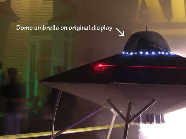 El interior de las cúpulas fueron encendidos con la luz de la tienda nombre UFO que cuestan $10 cada uno. Puesto que era con pilas, funcionó muy bien en el platillo más pequeño, pero probablemente se utilizo una sola más grande enchufe accesorio bulbo la próxima vez la cabina de la nave nodriza porque era tan grande la cúpula y crea un punto brillante en la parte superior.